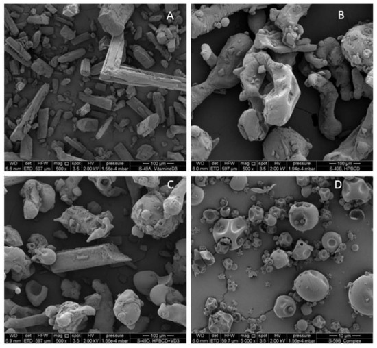 The SEM technique was utilized to investigate the particle size and morphology of the VD/CD complexes [42,93,98]. Bakirova and co-workers studied the formation of the VD3/βCD inclusion complexes with a molar ratio of 1:2 using the SEM method. The comparison of sample surfaces showed significant differences between pure βCD, the physical mixture of VD3 and βCD, and the inclusion complex VD3/βCD. The SEM pictures revealed that βCD exhibited a crystalline rhombic structure, while VD3 displayed irregular-shaped particles. In the physical mixture, the characteristic particles of VD3 and the parallelogram structure of βCD existed coincidentally and separately, showing no change in the physical forms of the individual substances. In contrast, the inclusion complex presented a remarkable change in the morphology and the shape of the separate particles of VD3, and βCD was no longer indistinguishable. Modification in the shape of particles suggested the formation of the VD3 inclusion complex with βCD [93]. Similar results were obtained by Wang et al. [98] in studies on the VD3 complex with HPβCD. SEM images revealed the differences in the microstructures of pure VD3, HPβCD, their physical mixture, and a spray-dried VD3/HPβCD complex. The crystal structure of VD3 had a needle shape, while HPβCD’s image was typical for amorphous materials. In the SEM photo of the physical mixture, the crystalline VD3 could be found intermixed with HPβCD. However, the inclusion complex VD3/HPβCD displayed the typical morphology of spray-drying amorphous materials, and the particle size was less than 10 µm. The comparison of these four images showed that the complex had a different microstructure compared toVD3, HPβCD, and their physical mixture, which confirmed the formation of the inclusion complex and its amorphous nature [98].