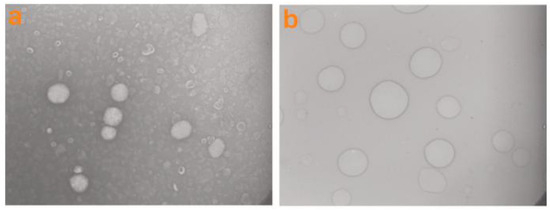 The transmission electron microscopy (TEM) images of the complex-loaded NLPs (a) and the coated complex-loaded NLPs with 2 mg/mL of gelatin (b). Reprinted with permission from [95].