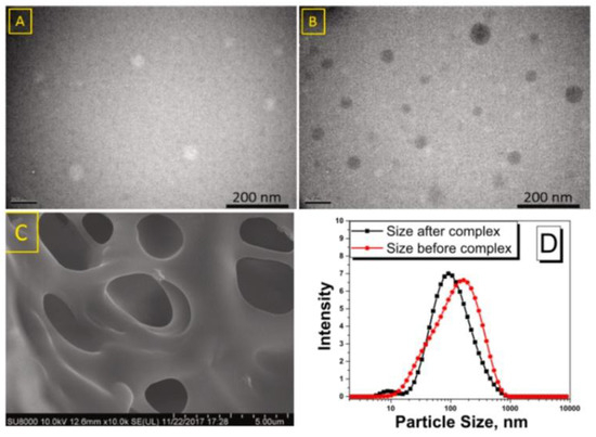 Field-emission scanning electron microscopy (FE-SEM) images of blank NLPs (A), the coated blank NLPs with 2 mg/mL of gelatin (B), the complex-loaded NLPs (C), and the coated complex-loaded NLPs with 2 mg/mL of gelatin (D). Reprinted with permission from [95].
