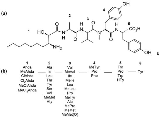 | 6 | 757.76 | 299-D | Cl2Ahda | Val | MeVal | MeTyr | Pro | - | M. aeruginosa (NIES-299) | Lake Kasumigaura (Japan) | [] |