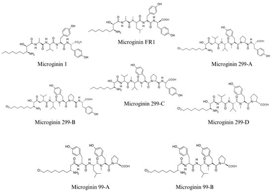 One year later, Ishida et al. (1998) [] elucidated the structures of two new structures isolated from the cyanobacterium M. aeruginosa (NIES-299), microginins 299-C and -D. Further investigations showed the identification of a linear peptide as a microginin from the cyanobacterium Oscillatoria agardhii (NIES-610) and two new peptides, microginins 99-A and 99-B, which were isolated from the cyanobacterium M. aeruginosa (NIES-99). Microginin 299-C is a linear peptide like microginins 299-A and B, whose N-terminus is not halogenated. Its Ahda stereochemical configuration was determined to be 2S,3S. Unlike the other Microginin 299s mentioned above, Microginin 299-D is composed of five amino acids, where the Tyr found in the last position is absent in this peptide. The first structures discovered and reported in the literature so far are shown in Figure 3 and Figure S1, respectively.