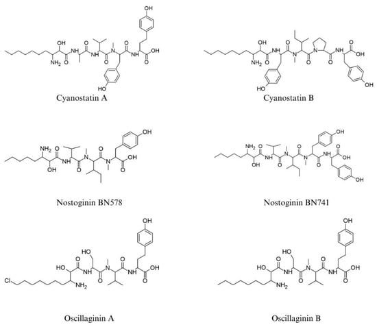 O. aghardii (NIES-610) was discovered in 1997 as a source of two new structures analogous to microginins, named Oscillaginin (Figure 4) [], which are tetrapeptides with the Ahda chlorinated in one structure and non-chlorinated in the other. Oscillaginin A has an MW of 617 Da and is determined by the amino acid sequence ClAhda-Ser-N-MeVal-Tyr. The spectral data determined that Oscillaginin B is closely related to the first compound, except for the Ahda ending which is not chlorinated. The same β-amino acid residue was found in Microginin 1 [] and its configuration was determined as 2S,3R []. Like oscillaginin, nostoginins are examples of the linear peptide class (Figure 4). In the C-terminal position of nostoginins, the 3-amino-2-hydroxydecanoic acid (Ahda) residue present in microginins is replaced by 3-amino-2-hydroxyoctanoic acid (Ahoa) (e.g., Ahoa-Val-MeIle-MeTyr) []. The Nostoginin BN741 (MW 741 Da) isolated by Ploutno and Carmeli (2002) [] inhibited bovine amino peptidase activity with an IC90 of 1.3 M.
