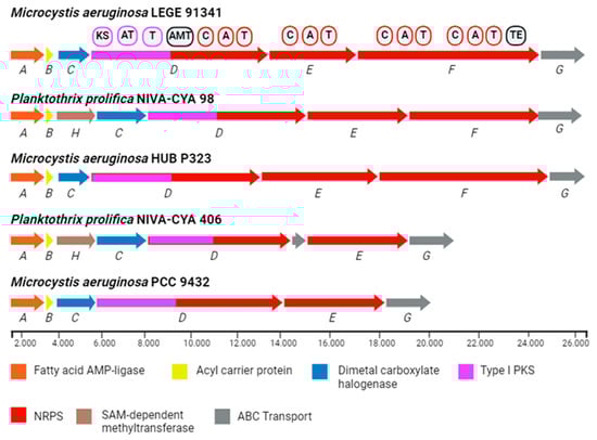 A graphical representation of microginin biosynthetic gene clusters. BGC: M. aeruginosa LEGE 91341 (accession BGC0002623); Planktothrix prolifica NIVA-CYA 98 (accession AM990468); M. aeruginosa HUB P323 (accession N.I.); P. prolifica NIVA-CYA 406 (accession DQ837301); M. aeruginosa PCC 9432 (accession CAIH01000183).