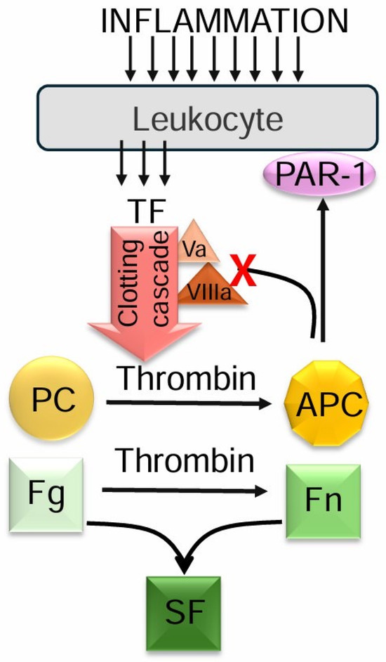 A schematic representation of the relationship between inflammation and hemostasis, highlighting the role of protein C. Inflammation activates leukocytes, leading to the expression of tissue factor (TF), the primary trigger of the clotting cascade, which ultimately generates thrombin. Thrombin, the central enzyme of blood coagulation, converts fibrinogen (Fg) into monomeric fibrin (Fn). In the early stages of this process, monomeric fibrin can be associated with fibrinogen and other fibrin molecules, forming macromolecular complexes of circulating soluble fibrin (SF). Additionally, thrombin initiates anticoagulant mechanisms by activating protein C (APC), which suppresses clotting cascade factors Va and VIIIa and cleaves protease-activated receptor-1 (PAR-1) on immune cells. This process depletes the total protein C levels. Consequently, protein C concentration serves as a potential indicator of clotting propagation, soluble fibrin accumulation, and inflammation. Abbreviations: APC—activated protein C, TF—tissue factor, PAR—protease-activated receptors, Fg—fibrinogen, Fn—monomeric fibrin, SF—soluble fibrin.