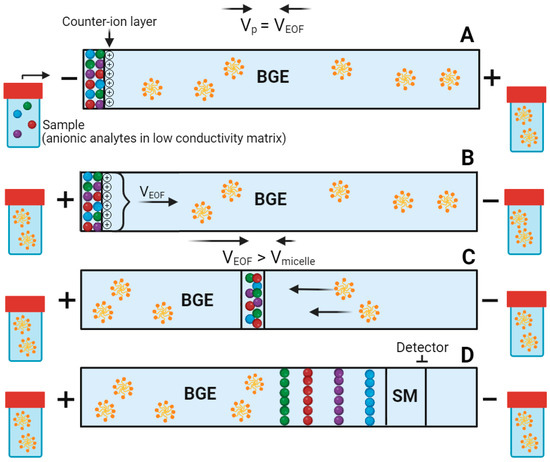 (A) In the initial situation, a sample with low conductivity (0.01 mM NaOH) is present at the inlet of the capillary, while a micellar BGE is located at the outlet. Voltage is applied with reversed electrode polarity, simultaneously utilizing pressure that counterbalances the EOF, which is directed opposite to the applied pressure. The analytes preconcentrate at the sample/BGE interface, where a layer of counterions (cations) stabilizes it. (B,C) The sample at the capillary inlet is replaced by the BGE, and the electrode polarity is switched to normal, leading to the migration of accumulated anions. In this case, the EOF is directed toward the capillary outlet (cathode), and its value exceeds the migration velocities of the micelles. Mixed micelles of SDS and Brij-35, which have a net negative charge and an apparent migration direction toward the anode (note that VEOF > Vmicelle), interact with the analytes, enhancing the separation potential. (D) The separated and stacked analytes migrate through the detection window. SM—sample matrix.