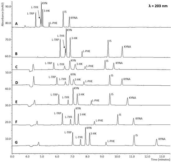 The electrophoretic separation of kynurenines at increasing concentrations of surfactants in the BGE, (A) without SDS and Brij-35, (B) 20 mM SDS, (C) 2 mM Brij-35, (D) 2 mM Brij-35 and 5 mM SDS, (E) 2 mM Brij-35 and 10 mM SDS, (F) 2 mM Brij-35 and 20 mM SDS, (G) 2 mM Brij-35 and 30 mM SDS. Other conditions: BGE: 20 mM Na2B4O7, 20% (v/v) MeOH; applied voltage 25 kV, HDI (5 s, 0.5 psi), capillary: 50 cm (length) × 50 µm. Analytical wavelength: 203 nm. Analyte concentration: each at 20 μg/mL. IS—internal standard (phenobarbital).