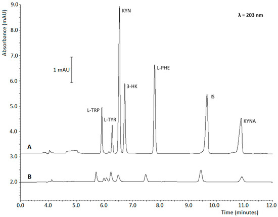Signal enhancement effect for kynurenine pathway compounds using the PAEKI-MEKC technique and the mixed micelle system compared to standard HDI coupled with the MEKC separation. (A) PAEKI: 2 min, −6.5 kV, 0.5 psi, (B) HDI 5 s, 0.5 psi. Other conditions: BGE: 2 mM Brij-35, 20 mM SDS, 20 mM Na2B4O7, 20% (v/v) MeOH; applied voltage: 25 kV; capillary 50 cm (length) × 50 µm (I.D.). Analytical wavelength: 203 nm. Analyte and IS concentration: (A) 1 μg/mL, (B) 20 μg/mL.