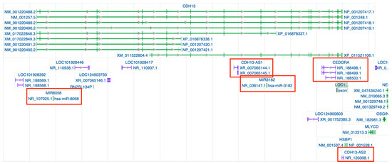 Genomic regions and transcripts of CDH13 indexed in the NCBI Gene ID database https://www.ncbi.nlm.nih.gov/gene/1012#top (accessed on 26 May 2025). Gray arrows within introns mark splice direction. Gene transcripts are shown in green, whereas non-coding RNA loci appear in purple; those highlighted in red are the specific ncRNAs discussed in this review. A complete graphical key is available in the NCBI legend (https://www.ncbi.nlm.nih.gov/tools/sviewer/legends/) (accessed on 26 May 2025).