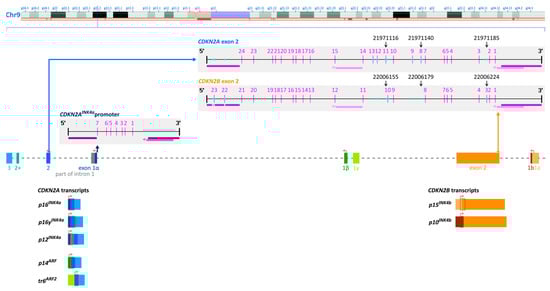 Figure 1 shows a scheme of chromosome 9, including the positions of the CDKN2AINK4a promoter, the second exons of CDKN2A (blue) and CDKN2B (orange), the CpGs in these regions, and respective transcript variants. However, all transcripts of CDKN2A and CDKN2B result from the lower strand.