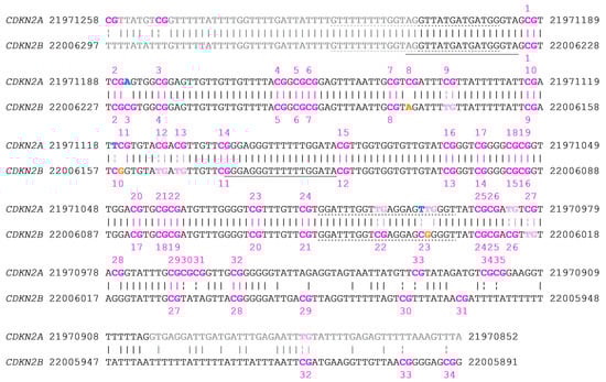Sequence alignment of the bisulfite converted lower strand of chromosome 9 CDKN2A exon 2 (black), plus 50 bp up- and downstream (gray), respectively, with CDKN2B, using NCBI blastn. Alignment was annotated using coordinates from GRCh38.p14 primary assembly and highlighted manually. CpGs (pink; numbered according to their position in CDKN2A exon 2). PCR primers are indicated by dotted horizontal lines, sequencing primers by straight horizontal lines. C-to-T transitions affecting CpGs are indicated by dashed vertical lines. Bases specific for CDKN2A and CDKN2B are highlighted in blue and orange, respectively.