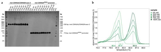 Since HRM is highly suitable for detecting the co-occurrence of different alleles [], PCR products were subjected to HRM before they were used for PSQ. HRM analysis of the PCR products obtained for 0%, 25%, 50%, 75%, and 100% methylated DNA standards resulted in the negative derivative of normalized HRM curves shown in Figure 3b. HRM curves obtained for DNA standards indicate that for the unmethylated standard, products for CDKN2A and CDKN2B exon 2 were obtained. In case of the 100% methylated DNA standard, the proportion of CDKN2B was too low and thus did not result in a shoulder.