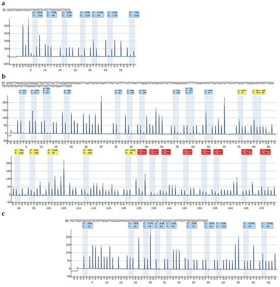 Representative pyrograms for the methylated (100%) DNA standard. (a) CDKN2AINK4a promoter CpGs 1–7 and (b,c) CDKN2A/CDKN2B exon 2 with (b) sequencing primer 1, targeting CpGs 1–24/CpGs 1–21, and (c) sequencing primer 2, targeting CpGs 15–24/CpGs 12–21. Peaks highlighted in blue–grey indicate the position to analyze; grey bars represent the expected heights according to the dispensation order (histogram). Nucleotide frequencies are shown above the respective position to analyze. Blue, yellow, and red colors indicate the quality of the result (blue: passed, yellow: check, red: failed).