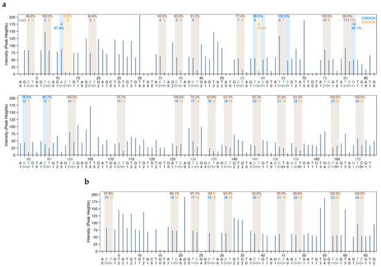 Figure 4b,c show representative pyrograms, obtained for the 100% methylated DNA standard. By using only one sequencing primer (Figure 4b), DNA methylation levels of variable positions 19–26 could not be determined accurately since the signal to noise ratio was too low. This problem could be solved by applying a second sequencing primer (Figure 4c).