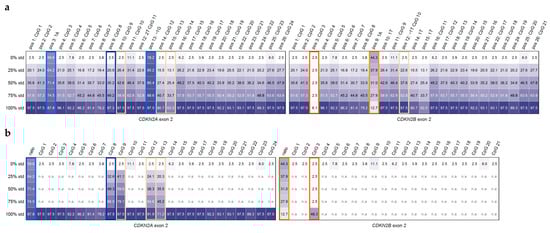 The DNA methylation levels for 0%, 25%, 50%, 75%, and 100% methylated DNA standards, obtained by our approach, are given in Figure 6a. For pos 9 CpG 8 (chr9:21971140), which is specific for CDKN2A, our results indicate that in the presence of a higher proportion of CDKN2B, the results have to be corrected by eliminating the contribution of CDKN2B (Figure 6a,b). The correct DNA methylation level of the respective CpG in CDKN2A exon 2 is obtained by multiplying the DNA methylation given by 100 and dividing it by the proportion of CDKN2A exon 2 (pos 3 A, chr9:21971185). These corrections are necessary for pos 10 CpG 9, pos 14 CpG 12, and pos 15 CpG 13 because the DNA methylation status given refers to CDKN2A, whereas the DNA sequence of CDKN2B contains a T.