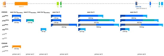 Primer sets 1–3 (Table 2) target CDKN2A exon–exon boundaries, whereas primers from sets 4–6 (Table 3) do not bind exon–exon boundaries. Transcript variants targeted by the respective primer set are shown in Figure 2.