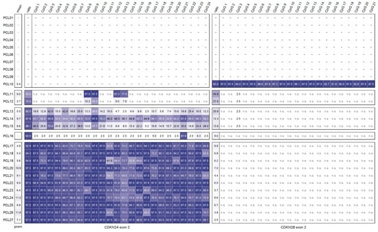 In nine PCLs (PCL10, PCL12, PCL13, PCL17-19, PCL23, PCL25, PCL27), the CDKN2AINK4a promoter was unmethylated (cut-off 8%), while in eight PCLs (PCL11, PCL14, PCL15, PCL20-22, PCL24, PCL26), it showed slight methylation. In two of these samples (PCL11, PCL12), the ratio of PCR products for CDKN2A exon 2 and CDKN2B exon 2 was <80%. Thus, reliable methylation levels were only obtained for five CpGs—those that are specific for CDKN2A exon 2 and CDKN2B exon 2, as described above for mixtures of methylated and unmethylated DNA standards. In three samples (PCL13–PCL15), the proportion of CDKN2A exon 2 was between 80% and 90%. These samples showed moderate and relatively heterogeneous methylation across the 24 CpGs. In twelve PCLs (PCL16–PC27), the proportion of CDKN2A exon 2 was >90%, and these samples generally showed high methylation of CDKN2A exon 2.