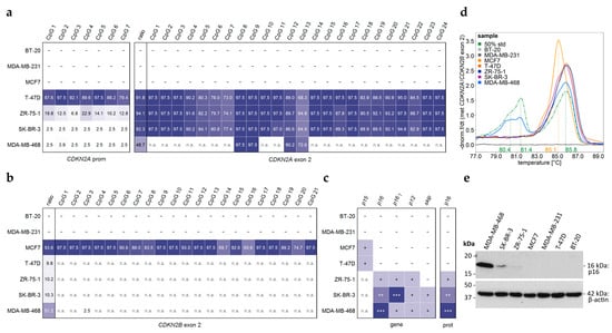 Seven commercial breast cancer cell lines (BT-20, MCF7, MDA-MB-231, T-47D, ZR-75-1, SK-BR-3, and MDA-MB-468) were analyzed for CDKN2AINK4a promoter and CDKN2A exon 2 methylation (Figure 9a–d). Unlike sample set 1, RNA and protein fractions were also available for these cell lines, enabling us to investigate potential associations between the DNA methylation status of the CDKN2AINK4a promoter and CDKN2A exon 2 and gene transcription at both the mRNA and protein levels (Figure 9 and Figure 10).
