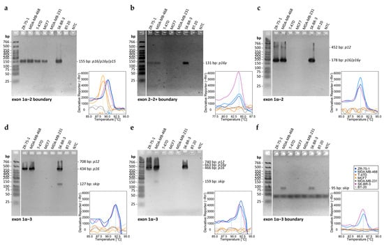 Identification of CDKN2AINK4a/CDKN2BINK4b transcripts by (a–f) agarose gel electrophoresis and melt curve analysis in commercial cell lines by applying different primer sets. Dotted lines: melting temperatures. The expected product length is shown on the right of the gel.