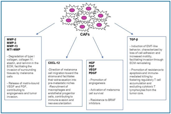 Beyond the production of chemokines, CAFs represent a crucial source of transforming growth factor beta (TGF-β), a cytokine that profoundly impacts melanoma progression. Within the primary tumor microenvironment, TGF-β acts on melanoma cells to induce changes similar to epithelial-to-mesenchymal transition (EMT), characterized by reduced cell adhesion, increased motility, and elevated expression of matrix metalloproteinases (MMPs). These alterations facilitate the remodeling of the extracellular matrix and support local tumor invasion [36].
