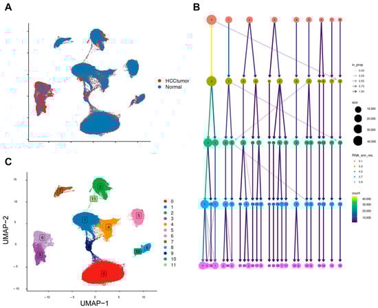 Current prognostic models, which are primarily derived from bulk transcriptomic or clinicopathological data [5,6,7], fail to distinguish the contributions of malignant cells from the tumor microenvironment (TME), limiting their clinical utility. Unlike traditional bulk-RNAseq, single-cell RNA-seq (scRNA-seq) can acquire transcriptome data for each cell at an unprecedented resolution [8]. Recent studies have revealed complex intra-tumor heterogeneity in the HCC microenvironment and identified various new cell subpopulations using scRNA-seq. Ma and Zheng used single-cell sequencing to map single cells in hepatocellular carcinoma and to resolve the heterogeneity of infiltrating T-cells in hepatocellular carcinoma tissues, respectively [9,10]. Nevertheless, further investigation is required to fully elucidate the gene-expression characteristics of tumor cells in HCC.