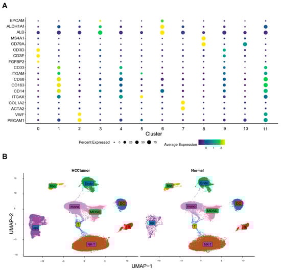We defined cluster 9 as T cells (CD3D, CD3E); cluster 0 as NKT cells (CD3D, CD3E, and FGFBP2); cluster 2 as endothelial cells (VWF and PECAM1); cluster 4 as MDSC cells (CD33 and ITGAM); clusters 8 and 10 as B cells (MS4A1 and CD79A); and clusters 1 and 11 as monocytes (CD68, CD163, and CD14). Clusters 3 and 6 were defined as epithelial cells (EPCAM, ALDH1A1, and ALB), cluster 7 as fibroblasts (COL1A2 and ACTA2), and cluster 5 as dendritic cells (ITGAX) [16,17]. Dot plots (Figure 2A) were used to illustrate the expression of marker genes, and UMAP plots (Figure 2B) were used to demonstrate the distributions of these cell populations in HCC and normal tissues.
