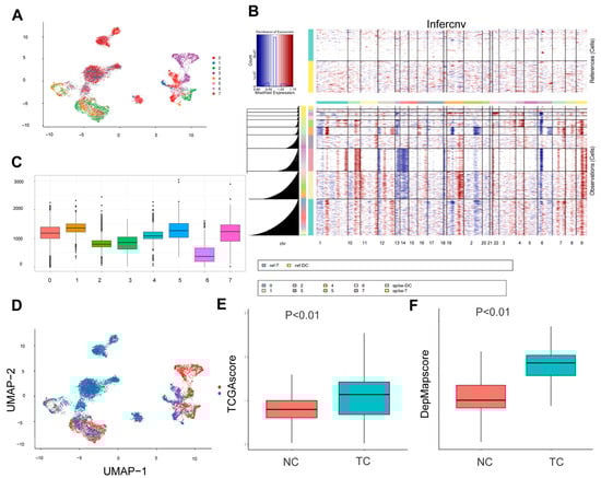 Subsequently, a total of 11,789 epithelial cells were extracted and re-clustered into eight distinct subpopulations (Figure 3A). The Infercnv algorithm [18] was then used to infer the identity of possible tumor cells using T and DC cells as reference cells (Figure 3B). It is worth noting that although T cells and DCs are generally considered to exhibit genomic stability, minor CNV-like signals may still emerge due to transcriptional noise or stress-induced fluctuations in gene expression, as previously reported [19,20]. Clusters 0, 1, 4, 5, and 7 were found to have significantly higher CNV scores compared to the other cell clusters (Figure 3C), thereby indicating their potential identities as tumor cells (Figure 3D). The top 100 genes with elevated expression (ranked by LogFC) in hepatocellular carcinoma tissues were obtained from GEPIA (Table S1), and the top 100 genes associated with the survival of hepatocellular carcinoma cells (ranked by Gene effect) were obtained from DepMap (a genome-wide screening database) (Table S2). Scoring of tumor and normal cells revealed that malignancy scores were significantly higher in tumor cells than in normal cells (Figure 3E,F).