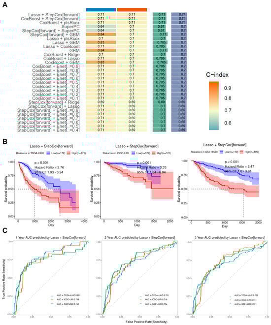 The ‘Mime’ package was employed to construct prognostic or diagnostic models from the transcriptome [41], integrating 101 machine learning algorithms. The machine learning was performed using the ‘Mime’ package with TCGA-LIHC (training set) and ICGC-LIRI (validation set) and GSE14520 (validation set).