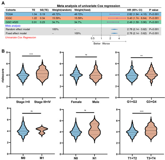 Risk scores were strongly correlated with clinicopathological characteristics. (A) Forest plot illustrating the results of univariate Cox regression analysis. (B) Box–and–line plot illustrating the relationship between pathological characteristics and risk scores. ** p < 0.01, *** p < 0.001, ns: not significant.