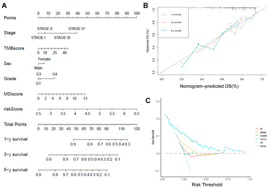 Risk scores were analyzed in conjunction with other clinicopathological features. (A) Column line graph analyzing the clinical predictive power of risk scores. (B) Calibration curve testing the predictive power of risk models. (C) DCA assessing the clinical diagnostic power of risk scores.