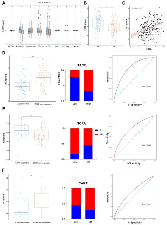 Relationship between risk scores and commonly used therapies for HCC. (A) Differences in immune function between risk groups. (B) Box line plot demonstrating TIDEScore between risk groups. (C) Positive correlation between risk scores and TIDEScore. (D–F) Relationship between risk scores and responses to TACE, SORA, and CART therapies. From left to right: risk scores for patients in different response groups, bar graphs showing the distributions of responders and non-responders in high- and low-risk groups, and ROC curves demonstrating the ability of risk scores to distinguish between responders and non-responders. * p < 0.05, ** p < 0.01, **** p < 0.0001, and ns means not significant.