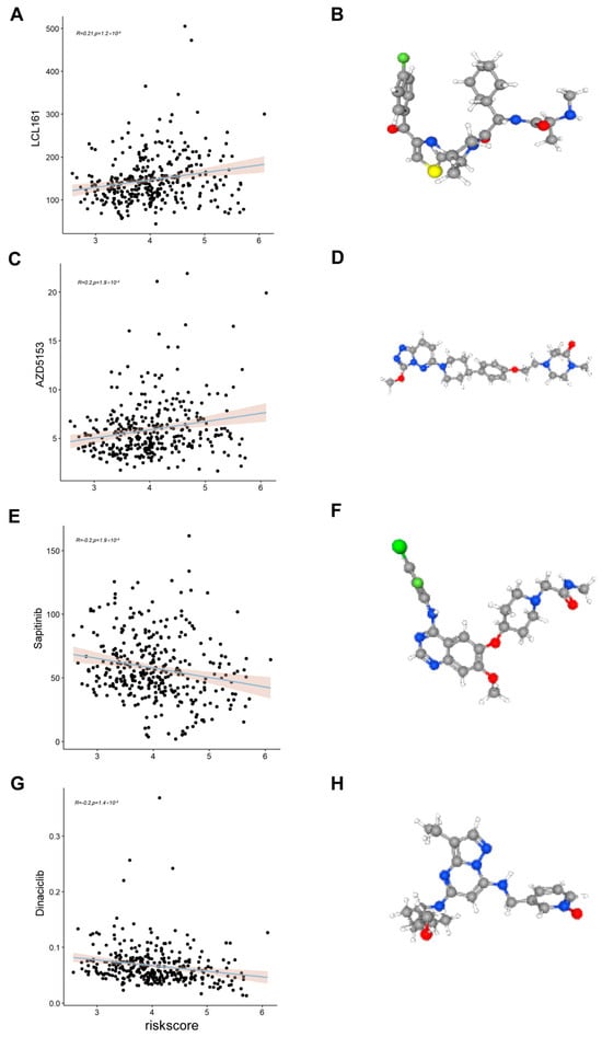 Predicting drug sensitivity. (A,C,E,G) Scatter plots of the correlation of risk scores with LC161, AZD5153, sapitinib, and dinaciclib. (B,D,F,H) 3D structural maps of LC161, AZD5153, sapitinib, and Dinaciclib from PubChem. Carbon atoms are shown in gray, hydrogen in white, oxygen in red, nitrogen in blue, sulfur in yellow, phosphorus in orange, chlorine in green, bromine in dark red, iodine in violet, and fluorine in light green.