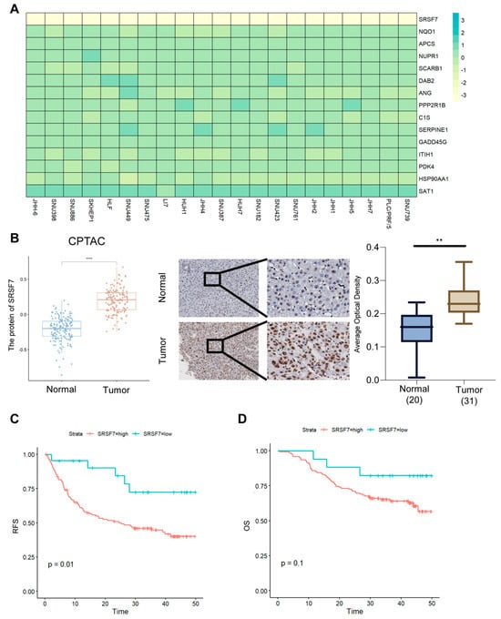 Poor prognosis of hepatocellular carcinoma in patients with high expression of SRSF7. (A) Gene=effect heatmap of prognostic genes in hepatocellular carcinoma cells from DepMap. (B) SRSF7 protein expression from the CPTAC (protein database). (C) Expression of SRSF7 in clinical hepatocellular carcinomas and normal tissue samples and the corresponding statistical results. (D) Recurrence-free survival (RFS) and overall survival (OS) in high- vs. low-SRSF7-expression groups. ** p < 0.01, **** p < 0.0001.