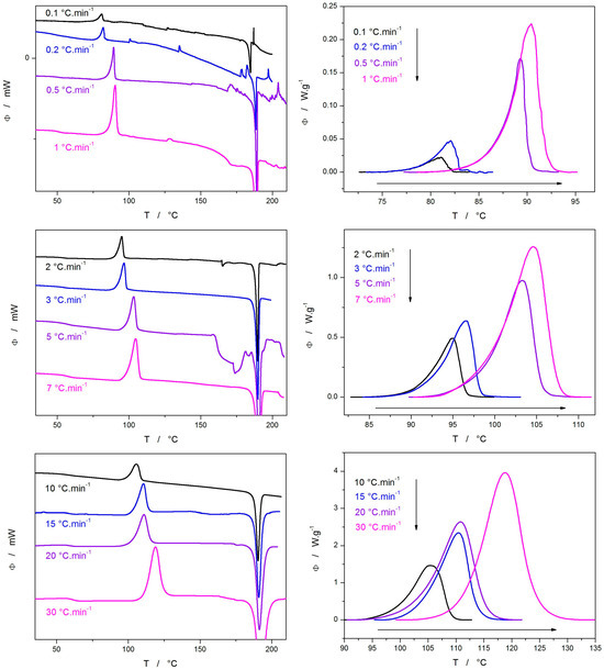 Raw DSC heating curves (right column); crystallization signals with subtracted thermokinetic background (left column). Exothermic effects evolve in an upward direction.