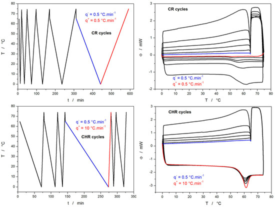 Following the overall characterization of the CBZ amorphous samples, this research was further focused on the processes that were not fully described by the simple heating scans depicted in Figure 1. The first such process, essential for the behavior of the amorphous phase, the position of Tg, and the consequent growth of crystals, is structural relaxation, i.e., the reorganization of the amorphous phase below Tg at long timescales [32,33]. The relaxation measurements were performed in accordance with the standard procedure [47], utilizing the constant ratio (CR) and constant heating rate (CHR) cyclic experiments. During these measurements, the same sample (one for each set of cycles) is repeatedly cycled through the glass transition region at different rates. In CR cycles, the heating rate is always the same as was in the previous cooling step; during the CHR cycles, q+ is constant (10 °C·min−1), and only q− varies. As the sample needs to be equilibrated (usually 30–60 s) above Tg to achieve a reproducible state of the undercooled liquid, and the measurement needs to be performed to a high enough temperature for the temperature dependence of heat capacity (cp-T) to be extrapolatable, the low thermal stability of the CBZ amorphous phase started to play a role. The first series of measurements was performed in the temperature range of 0–75 °C. However, the repeated equilibration of the sample at 75 °C (despite being for only 30 s) led to a quick degradation of the amorphous phase—an almost complete crystallization occurred within a few cycles. Hence, the temperature program of a cycle was adjusted as follows: (1) cooling from 65 to 0 °C, (2) heating from 0 to 75 °C, (3) immediate cooling from 75 to 65 °C, and (4) equilibration for 60 s. The CR and CHR cycles temperature programs and the corresponding DSC data are shown in Figure 2; the applied cooling rates were q− = 0.5, 1, 2, 3, 5, and 10 °C·min−1 (the cooling from 75 to 65 °C was always 10 °C·min−1).
