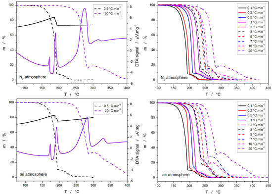 Selected joint DTA-TGA signals obtained for the CBZ decomposition in N2 and air atmospheres (left column)—exothermic effects evolve in a downward direction; the (right column) depicts full sets of TGA measurements.