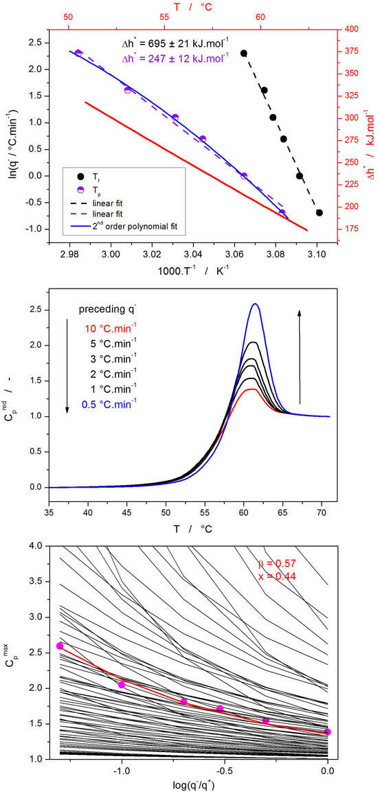 where q− is the cooling rate applied just before the heating step, from which either the temperature of the maximum of the relaxation peak Tp or the fictive temperature Tf is evaluated. Note that Tf is usually calculated using the Moynihan equal-area method [56]. The indices “exp” and “true” refer to the experimentally obtained (via Equation (6)) and true values of activation energy Δh*. These evaluations are based on the current data on the structural relaxation of CBZ, as depicted in the top graph of Figure 5. The listed Δh* values were calculated from the linear fits of the two dependencies shown. It is immediately clear that the slopes of both dependencies are vastly different. This is a common issue when the Moynihan method often largely overestimates the true Δh* values [47]. However, even the evaluation from the CR cycles, as determined by Equations (6) and (7), did not yield a uniform Δh* value due to the curvature of the corresponding dependence. Hence, to obtain the most accurate results, a second-order polynomial fit was used, and the Δh*-T dependence was calculated from its derivation (in accordance with Equation (6)). In the explored q+/T range, the activation energy of structural relaxation decreases from ~320 to 175 kJ·mol−1.