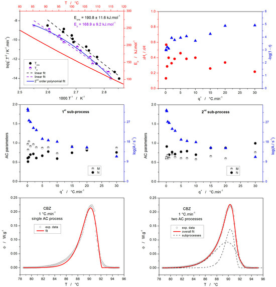 where Tp is the temperature corresponding to the maximum of the crystallization peak. Technically, the same evaluation can be applied to any other characteristic temperature that is evaluated with sufficient precision and represents a state with constant conversion α. For the present data, the Kissinger method was applied to the Tp as well as Tons data from Table 1; the results are shown in the top left graph of Figure 6. Since both dependencies are evidently curved, exhibiting temperature-dependent kinetics, the E values obtained via linear fitting should be viewed only as a rough estimate. A much more accurate evaluation can be obtained by interpolating the dependence using a second-order polynomial function—its derivation can then be used to calculate the E-T dependence (which is, for the present CBZ data shown in correspondence to the top and right axes of the top left graph in Figure 6). Note that very similar values (lower by ~10 kJ·mol−1) of E were also obtained by means of the Augis–Bennett method [62].