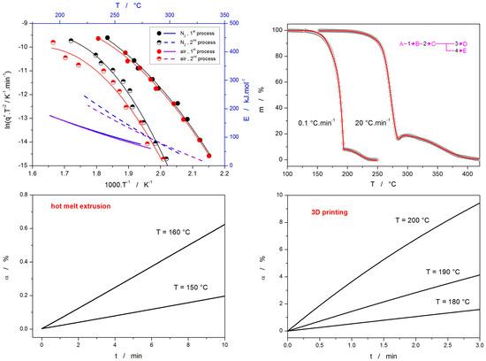 (Top left graph): Kissinger evaluation of E using the temperatures corresponding to the TGA points of inflection determined from the derivative TGA data for the two step-like mass losses (bottom and left axes); E-T dependences determined from the Kissinger dependences fit by the 2nd-order polynomials (top and right axes). (Top right graph): Example TGA data (measured under N2 atmosphere) fit by the sc-MKA method employing the depicted reaction scheme. (Bottom graphs): Kinetic predictions calculated using the kinetic parameters determined for the 0.1 °C·min−1 TGA data-curve obtained under N2 atmosphere—the predictions were calculated for isothermal annealing at denoted temperatures characteristic for the processes of pharmaceutical hot melt extrusion and 3D printing.