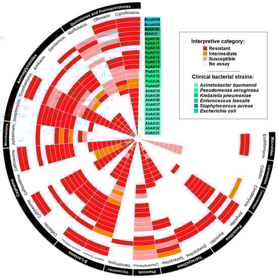 Antimicrobial resistance pattern of clinical strains of Acinetobacter baumannii, other ESKAPE pathogens, and Gram-negative pathogens. The antimicrobial resistance profiles were determined by measuring the diameter of the inhibition zone using the Kirby–Bauer disk diffusion assay. The tested antimicrobials were specific to each bacterial genus according to CLSI protocols.
