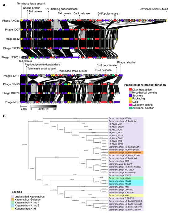 Genomic characterization of phages within the Kagunavirus genus. (A): Phage comparison with the phage JSSK01 reference genome performed using the Clinker tool. Homologous regions between phages are shown with gray shading. Colored arrows represent ORFs based on their predicted function according to their module. (B): Phylogenetic tree of phages constructed using Genome-BLAST Distance Phylogeny within the Kagunavirus genus, Guernseyvirinae subfamily.