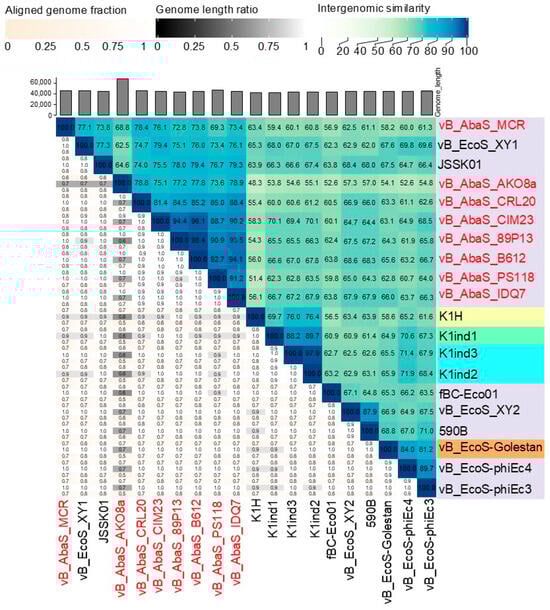 Subsequent BLASTN nucleotide analysis of the phage genomes revealed a close sequence similarity to 12 E. coli phages, with more than 80% nucleotide identity to the eight selected phages. Phage JSSK01 (OQ442786.1) was identified as the closest relative, showing more than 80% coverage and more than 95% identity. The phylogenetic tree confirmed that E. coli phages were potentially the closest ancestors (Figure 3B). Intergenomic comparisons using VIRIDIC software (available online: https://rhea.icbm.uni-oldenburg.de/viridic/; accessed on 8 April 2025) (Figure 4) placed all eight phages within the genus Kagunavirus, with more than 70% similarity to E. coli phages JSSK01 and vB_EcoS_XY1, suggesting that the phages examined in the present study represent a novel, unclassified species. Following the International Committee on Taxonomy of Viruses (ICTV) criteria, the phages were designated as A. baumannii phages vB_AbaS_AKO8a, vB_AbaS_PS118, vB_AbaS_B612, vB_AbaS_MCR, vB_AbaS_IDQ7, vB_AbaS_89P13, vB_AbaS_CRL20, and vB_AbaS_CIM23. Phage common names are AKO8a, PS118, B612, MCR, IDQ7, 89P13, CRL20, and CIM23, respectively. Classification was confirmed using PhageAI version 0.10.0 software with a 99.2% probability, aligning with ICTV taxonomy.
