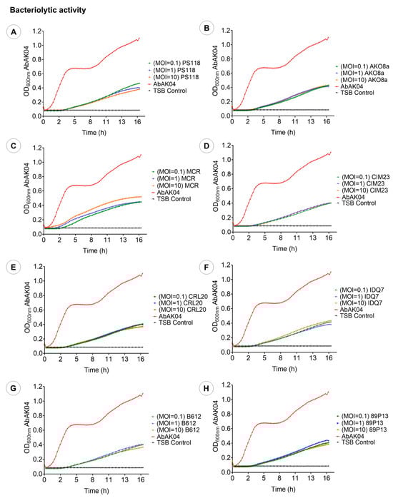 Bacteriolytic activity of eight phages at various MOIs (10, 1, and 0.1). (A): PS118. (B): AKO8a. (C): MCR. (D): CIM23. (E): CRL20. (F): IDQ7. (G): B612. (H): 89P13. Each graph presents the mean values of three tests (n = 3) ± standard deviation (SD), error bars represent the standard deviation.