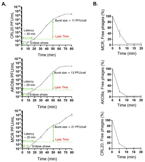 Lytic activity assays. (A): One-step growth curve for lytic phages AKO8a, MCR, and CRL20. The latency time corresponds to the time before newly formed phages are first detected in the supernatant. The lysis time, however, is defined as the time point at which phage release reaches a plateau, reflecting the completion of cell lysis in the majority of the population. Burst size was calculated at this plateau. (B): Adsorption curve for lytic phages AKO8a, MCR, and CRL20. Each graph presents the mean values of three tests (n = 3) ± standard deviation (SD).