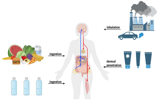 Humans can be exposed to MNPs in three ways: ingestion, inhalation, and dermal contact. These pathways of exposure are interrelated and contribute to the total amount of plastic particles in the human body. MPs are thought to most commonly be ingested. The principal sources are contaminated food and drinkable water. MPs have been found in a variety of products, including seafood, salt, sugar, tea bags, and milk [25]. According to many studies, Europeans consume between 39,000 and 52,000 MP particles per year through food consumption, with an extra 11,000 particles coming from eating shellfish [26]. Take-out food containers comprising common polymer materials such as PP, PS, PE, and PET are extensively used and have been discovered to contain MPs [27]. Individuals who order takeout food four to seven times a week may consume between 12 and 203 MP particles through containers [28]. Furthermore, studies show that silicone rubber baby teats deteriorate after steam sterilization, releasing MP particles into the environment [29]. It is estimated that the total quantity of MP particles entering a baby’s body throughout one year of typical bottle feeding is around 0.66 million [30]. Another major source of MP exposure is inhalation. Airborne MPs are made up of PE, PS, and PET particles and fibers, ranging in size from 10 to 8000 µm. The majority of MPs in the atmosphere (84%) come from automobile activity. MP fiber concentrations in outdoor and indoor air have been found to vary according to studies [31]. In Paris, the median concentration of MP fibers in outdoor air is 5.4 fibers/m3, whereas interior air has 0.9 fibers/m3 [32]. When oral intake and inhalation are combined, annual MP consumption is predicted to be between 74,000 and 121,000 particles [33]. Infants and children have been found to spend more time indoors, possibly contributing to increased susceptibility as a population group. Although the concentration of MPs in indoor air below 1 m height has not been well documented, children are much more likely to inhale and ingest dust particles. Indoor dust has been found to have a high concentration of MPs, ranging from 38 to 1.2 × 105 μg/g to <0.11 to 1700 μg/g in samples from 12 countries. Further, while adult estimates of annual MP consumption range from 4.0 × 102–2.5 × 104 particles, it is estimated that infants and young children consume 7.2 × 102–4.5 × 104 particles, showing a 1.8× larger consumption in the child population. Continually, during inspection of MPs in human feces, concentrations were found to be higher in infantile fecal matter than in adults, suggesting a higher exposure rate [34]. Dermal contact with MPs is an understudied but conceivable mode of exposure. MPs are generally thought to not pass through the skin barrier [35]. However, they can enhance exposure risk by accumulating on the skin. The usage of MP-containing consumer items, such as face creams and cleaners, increases the risk of PE exposure [36,37]. MPs can be generated by protective mobile phone cases during use, which are then transferred to human hands [38]. Some common plastic additives, such as brominated flame retardants, BPAs, triclosan, and phthalates, can be absorbed through cutaneous contact with MPs [39]. These chemicals are known to affect endocrine function and may increase health risks (Figure 1).