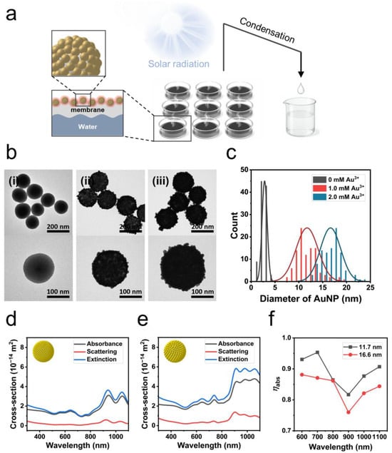 (a) Schematic illustration of solar-driven desalination system using photothermal membrane with bumpy gold nanoshell assembly. (b) TEM images of (i) gold nanoparticle-seeded silica nanoparticle and bumpy gold nanoshell grown with (ii) 1.0 mM and (iii) 2.0 mM Au3+ precursor. (c) Distribution of Au NP diameters corresponding to samples (i), (ii), and (iii) shown in (b) (n = 100). (d,e) Simulated spectra of absorption, scattering, and extinction cross-sections for bumpy gold nanoshell with different thicknesses (11.7 nm and 16.6 nm). (f) Absorption efficiency of bumpy gold nanoshells at different wavelengths.