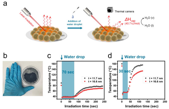(a) Schematic illustration of laser-induced water evaporation on the surface of the bumpy gold nanoshell film. (b) Bumpy gold nanoshell film on cellulose filter paper prepared by three-phase self-assembly method. Temperature changes in a spot wetted with a water droplet under the irradiation of (c) 635 nm laser and (d) 980 nm laser on the film of bumpy gold nanoshell with different shell thicknesses (11.7 nm and 16.6 nm).