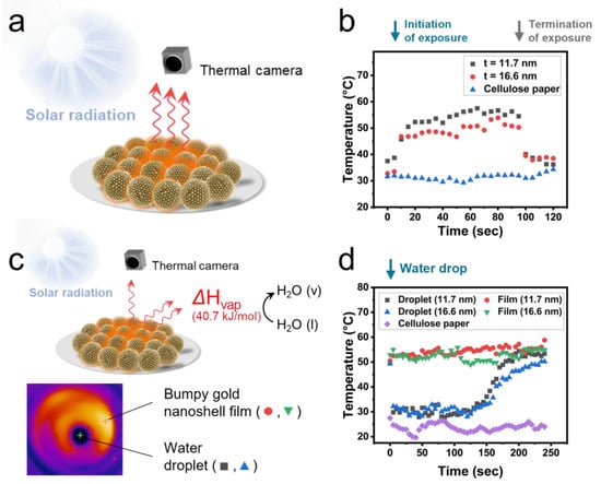 (a) Schematic illustration of heat generation of bumpy gold nanoshell film under sunlight exposure. (b) Temperature changes on filter paper (blue triangles), the film of bumpy gold nanoshell with shell thicknesses of 11.7 nm (black squares), and 16.6 nm (red circles). The films were exposed to sunlight for periods ranging from 5 to 95 s. (c) Schematic illustration of solar-driven evaporation of water on the film of bumpy gold nanoshell and thermal image captured immediately after the addition of a water droplet. (d) Temperature changes on sunlight-exposed filter paper (purple diamonds) and the film of bumpy gold nanoshells. The films were pre-exposed to sunlight for 30 s, and a droplet of water was added at the 5 s mark on the graph.