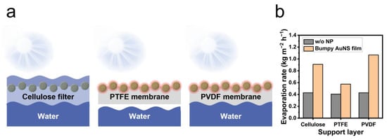 Comparison of the evaporation rate of the film of bumpy gold nanoshells with different support materials. (a) Schematic illustration of the cross-section of bumpy gold nanoshell films fabricated on different support materials (cellulose filter paper, PTFE membrane, and PVDF membrane) floating on water. (b) Percentage of the weight of evaporated water by bumpy gold nanoshell film with different support materials after 2 h of exposure to sunlight.