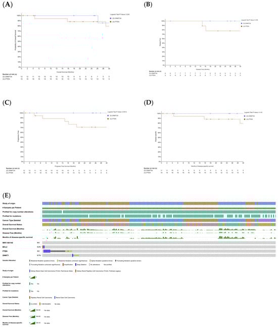 KIRC and KIRP survival data correlation with curcumin-sensitive genes. (A) Depicts the overall survival (OS) curve, with a log-rank p-value of 0.324, indicating a lack of significant correlation between patient OS and the expression of DNMT3A and PTEN. DNMT3A, a gene inhibited by curcumin, is known for its oncogenic activity, while PTEN, upregulated by curcumin, plays a crucial role in tumor suppression. (B) The disease-free survival (DFS) curve, with a log-rank p-value of 0.199, suggests no significant association between DFS and the expression of DNMT3A and PTEN. (C) The progression-free survival (PFS) curve, with a log-rank p-value of 0.0512, indicates a notable trend toward significance. This suggests that variations in DNMT3A and PTEN expression levels may have a meaningful impact on PFS. (D) The disease-specific survival (DSS) curve, with a log-rank p-value of 0.143, demonstrates the absence of a significant correlation between DSS and DNMT3A or PTEN expression. (E) The OncoPrint analysis reveals a higher overall survival rate in KIRP patients compared to KIRC patients, who exhibit specific genetic alterations in curcumin-sensitive genes. These alterations include 0% in MIR-148/148, 0.2% amplification and deep deletion in BCL-2, 3% deep deletion, truncating, splice, and missense mutations in PTEN, and 0.7% deep deletion and missense mutations in DNMT1. The asterisks (*) in Figure 1 highlight the differential extent of curcumin-sensitive genes altered in the study.