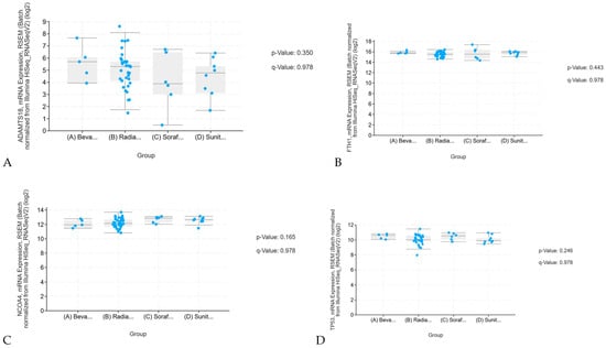 RNAseq Differential Expression of Curcumin-Sensitive Genes: This analysis examines the mRNA expression levels of curcumin-sensitive genes in relation to conventional therapies including bevacizumab, radiation, sorafenib, and sunitinib. Specifically, (A) presents a p-value of 0.350 and a q-value of 0.978 for ADAMTS18, (B) shows a p-value of 0.443 and a q-value of 0.978 for FTH1, (C) reports a p-value of 0.165 and a q-value of 0.978 for NCOA4, and (D) displays a p-value of 0.246 and a q-value of 0.978 for TP53. All p-values are well above the conventional threshold of 0.05, indicating no statistically significant associations between the expression of these genes and the response to conventional therapies. The elevated p-values suggest that any differences observed are likely due to random variation. Additionally, the consistently high q-values further confirm that, after adjusting for multiple testing, none of the results remain statistically significant and each carries a high likelihood of being a false positive. In (A–D), the abbreviations are defined as follows: Beva represents Bevacizumab, Radia denotes Radiation Therapy, Soraf corresponds to Sorafenib, and Sunit indicates Sunitinib.
